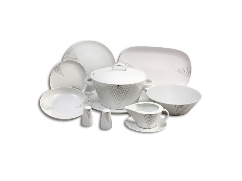 Moderní porcelánová jídelní souprava Tom dekorovaná stylovými šedými špičkami. Současný karlovarský porcelán, který je ideální do moderně zařízených interiérů.