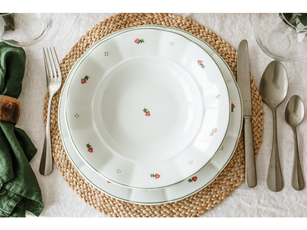 Porcelánová talířová souprava s velkým mělkým talířem 26 cm s dekorem růžových kytiček.