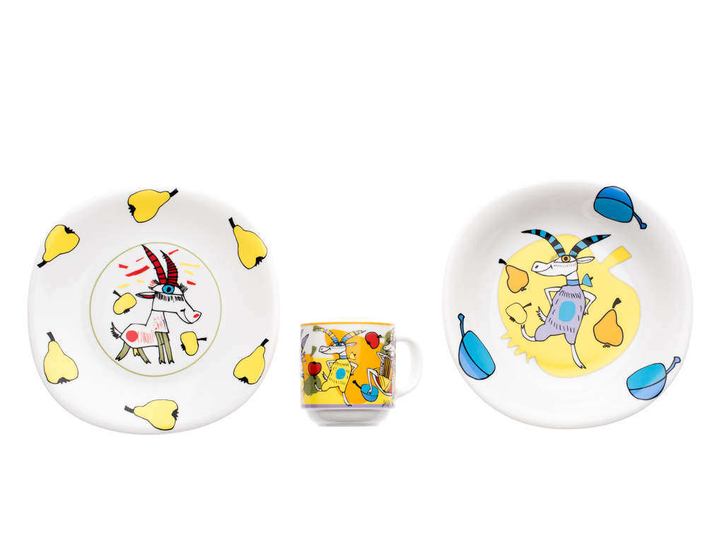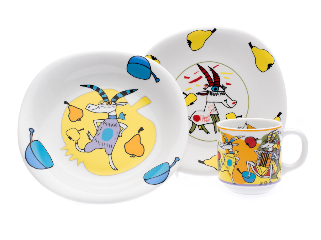 Dětská porcelánová souprava, Veselá koza, D. Raunerová, Suisse Langenthal, 3 d.