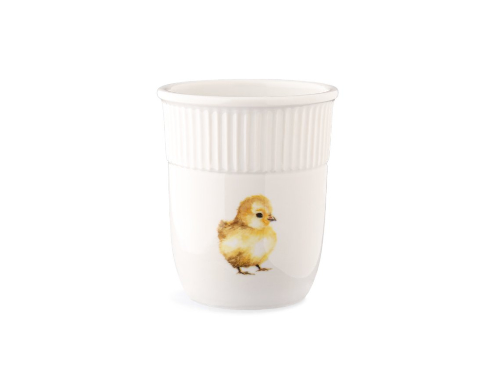 Menší 200 ml hrnek bez uch je perfektní na čaj nebo kávu s sebou na cesty. Výhodou tohoto dvoustěnného hrnku je, že udrží nápoj teplý po delší dobu a na dotek nepálí. Porcelánový hrnek s velikonočním motivem kuřátka má glazovanou vnější stěnu a glazovaný horní okraj včetně vnitřní stěny. Nadčasový hrnek s vroubkovaným okrajem. Jestliže hledáte originální dárek pro milovníka hrnečků, zvolte tento krásný kousek.