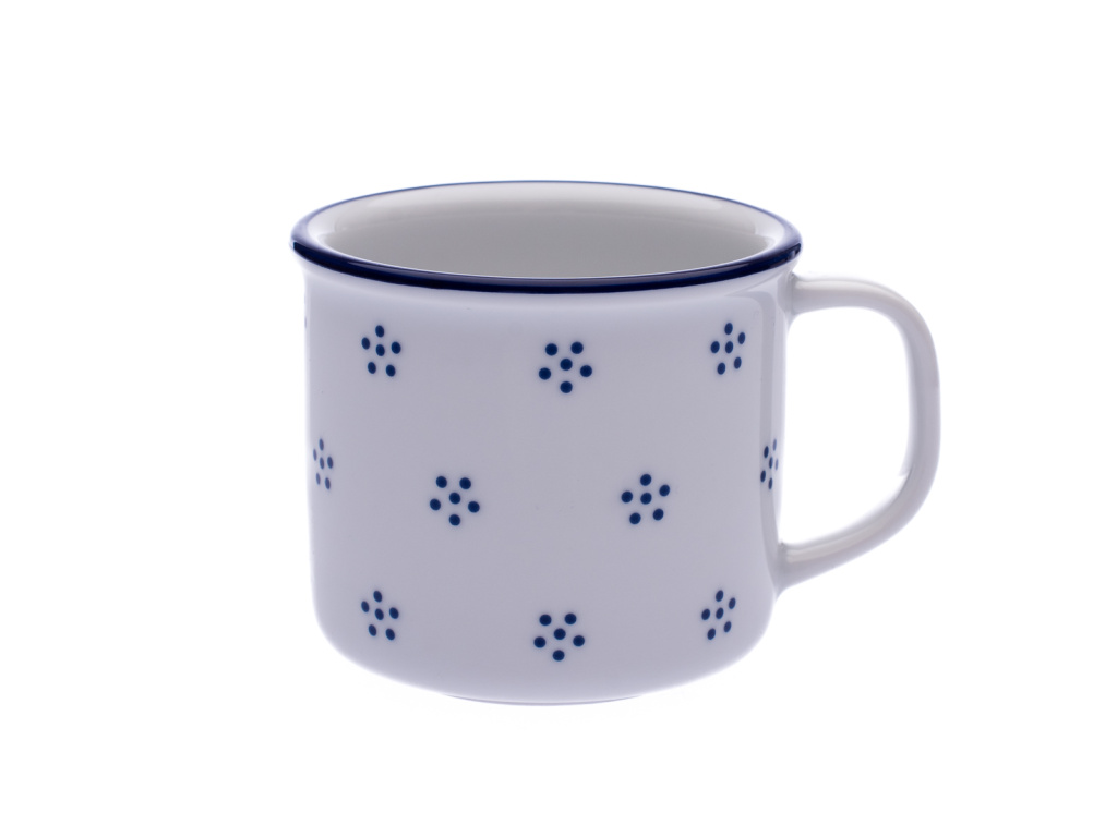 Menší porcelánový hrnek ve tvaru plecháčku s objemem 180ml. Dekor modré Valbelly má něžný květinový motiv a perfektně zapadne do rustikální nebo venkovské kuchyně. Vyrobeno z kvalitního karlovarského porcelánu.