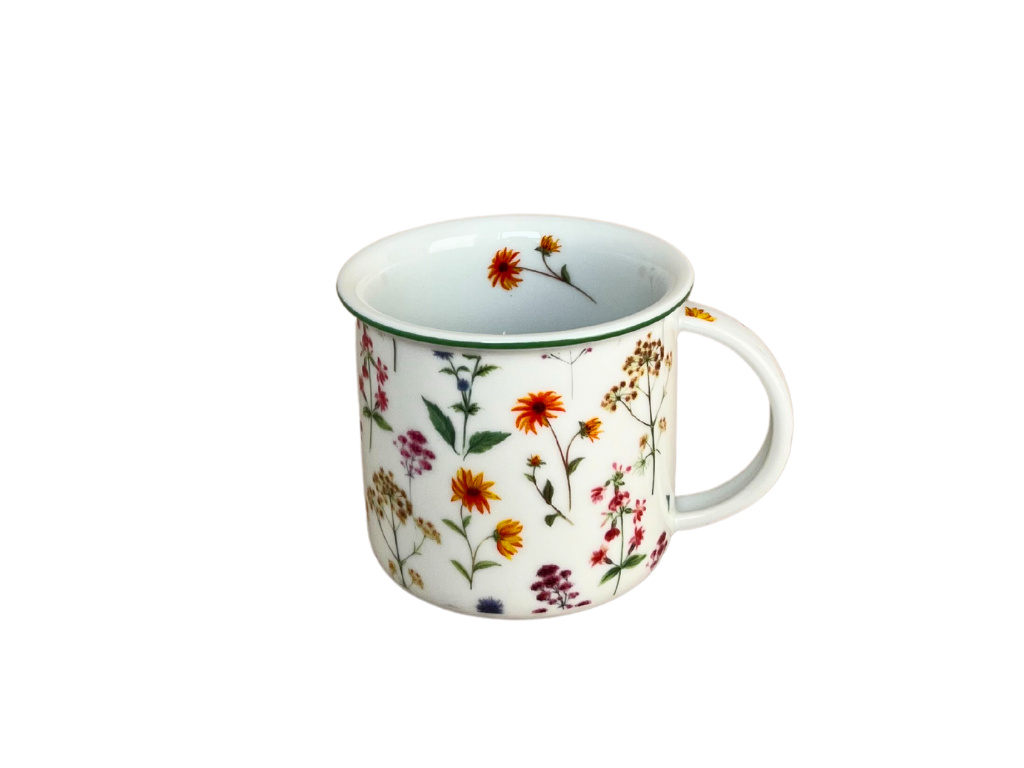 Porcelánový hrnek Tina s dekorem drobných lučních květů s zelenou linkou.