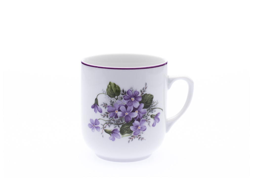 Porcelánový hrnek Trojka v krásném dekoru fialek. Příjemný objem 300 ml je ideální pro každodenní užití.