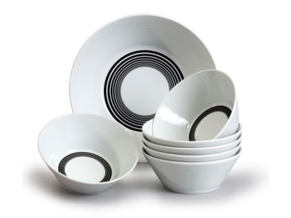 Porcelánová sada talířů s motivem černých kružnic. Obsahuje 18 ks nádobí.