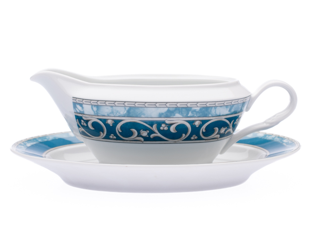 Porcelánový omáčník s podšálkem s dekorem modrého mramoru a ornamentu.