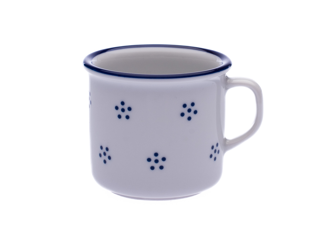 Malý porcelánový hrnek ve tvaru plecháčku s objemem 80ml. Dekor modré Valbelly má něžný květinový motiv a perfektně zapadne do rustikální nebo venkovské kuchyně. Vyrobeno z kvalitního karlovarského porcelánu.
