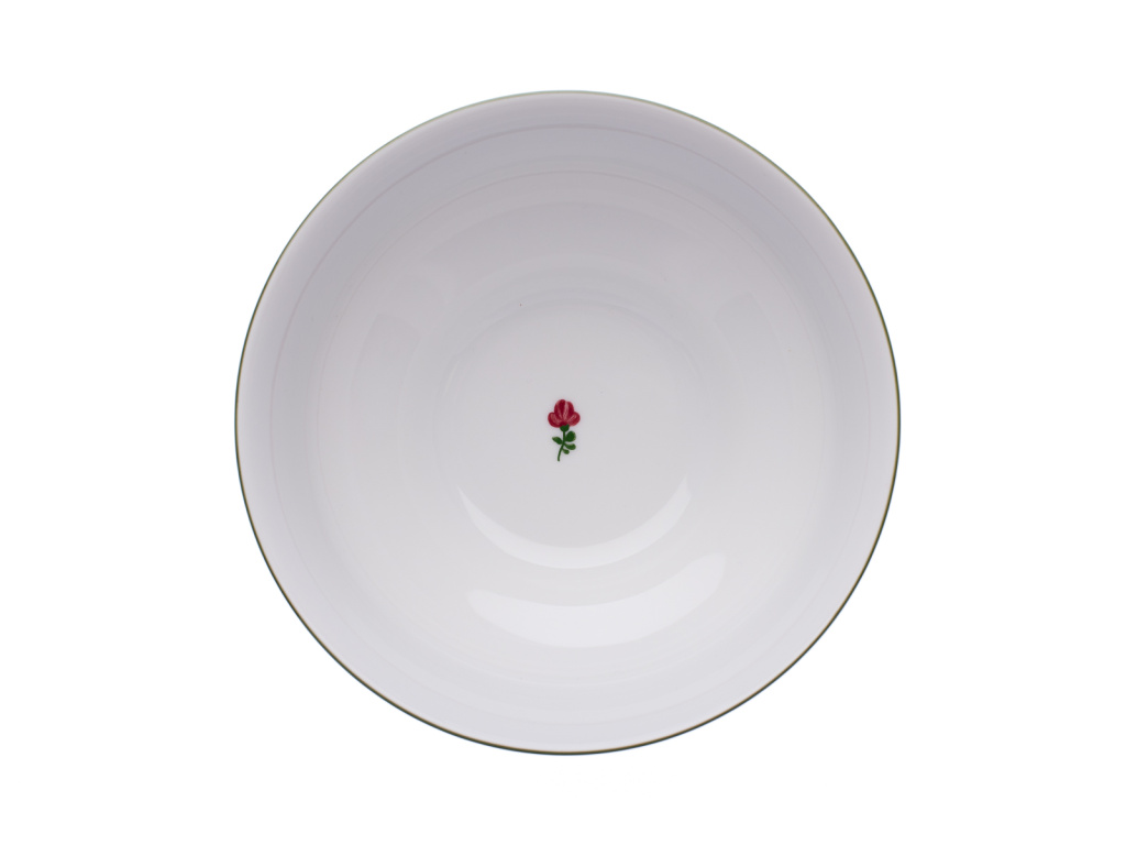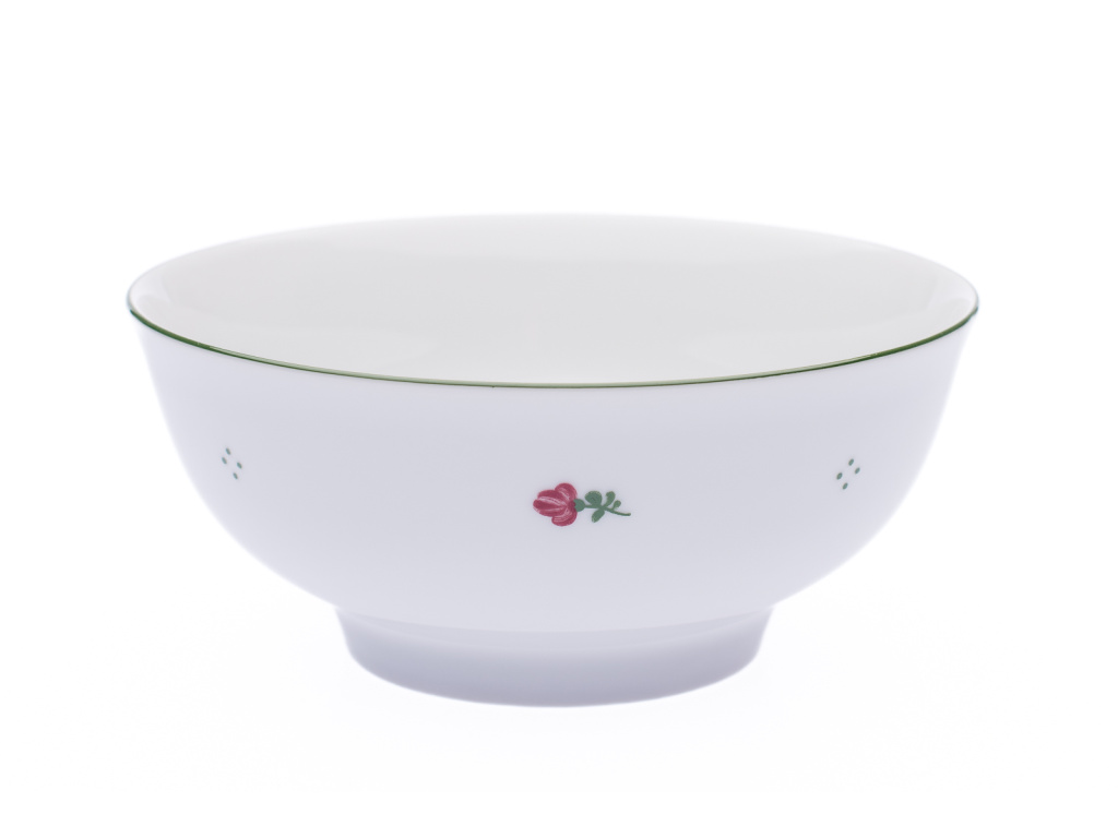 Porcelánová miska na polévku o průměru 16 cm s dekorem růžových kytiček a zelené linky.
