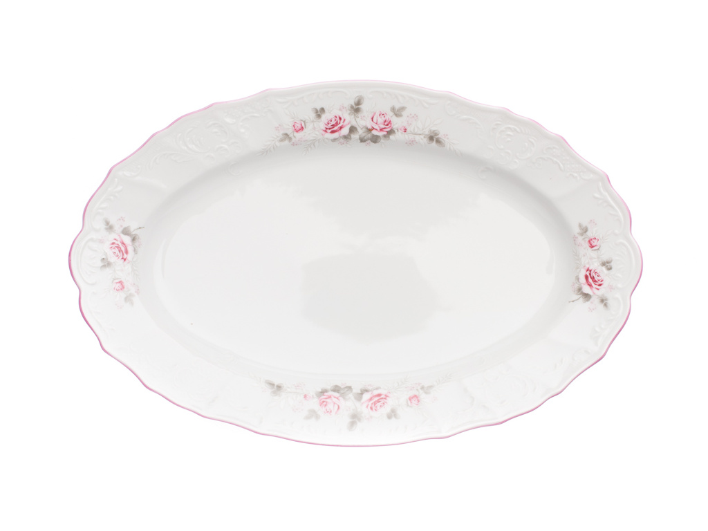 Porcelánová mísa oválná Bernadotte růžemi s růžovým proužkem. Délka 39 cm. Karlovarský porcelán Thun 1794 nejvyšší kvality vyniká vysokou odolností a bělostí. Porcelán je vhodný do mikrovlnné trouby a myčky nádobí.