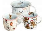 Konvička na čaj nebo kávu je ozdobená dekorem vánočních perníčků a typickými vánočními barvami - červenou, zelenou a bílou.